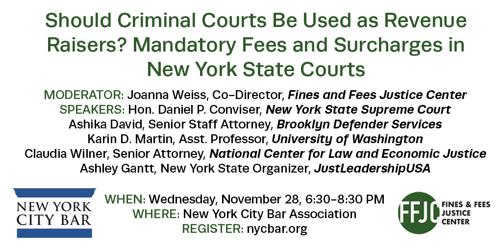 On Wednesday, November 28, FFJC Co-Director Joanna Weiss moderated a New York City Bar Association panel about New York’s mandatory surcharges. Joanna was joined by NY State Supreme Court’s Hon. Daniel P. Conviser, Brooklyn Defender Services’ Ashika David, University of Washington Professor Karin Martin, NCLEJ’s Claudia Wilner, and JustLeadershipUSA’s Ashley Gantt.