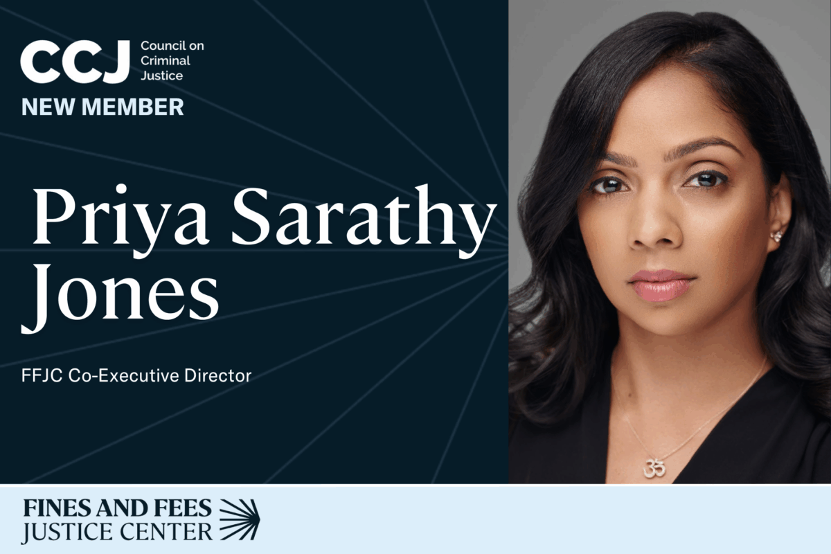 Washington, D.C. – Priya Sarathy Jones, co-executive director of the Fines and Fees Justice Center, has been elected as a member of the Council on Criminal Justice (CCJ), a nationally prominent think tank and invitational membership organization.